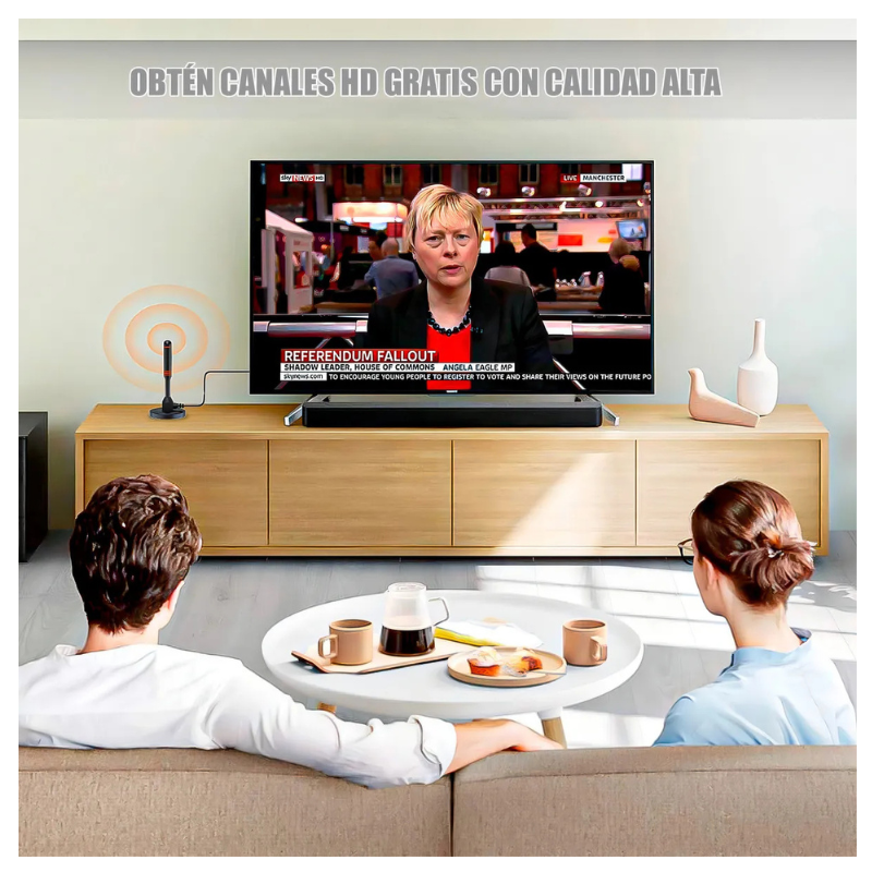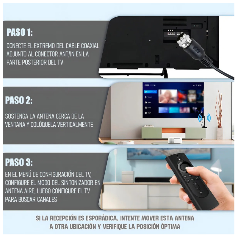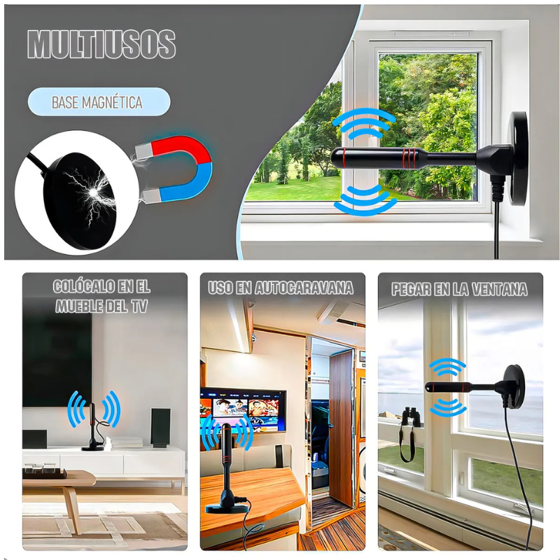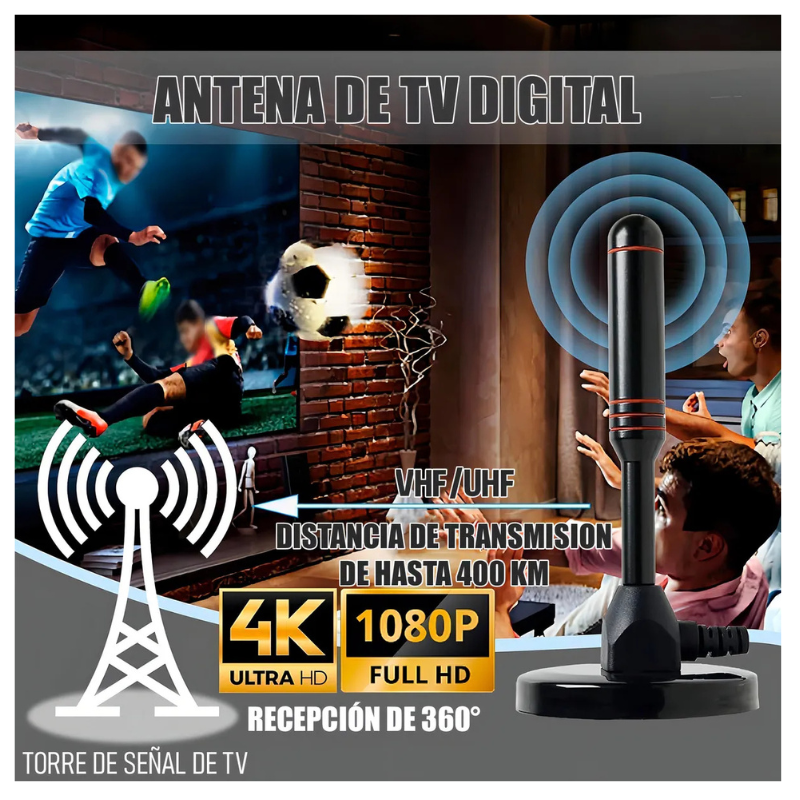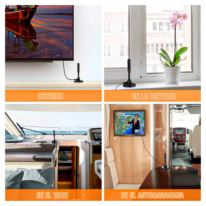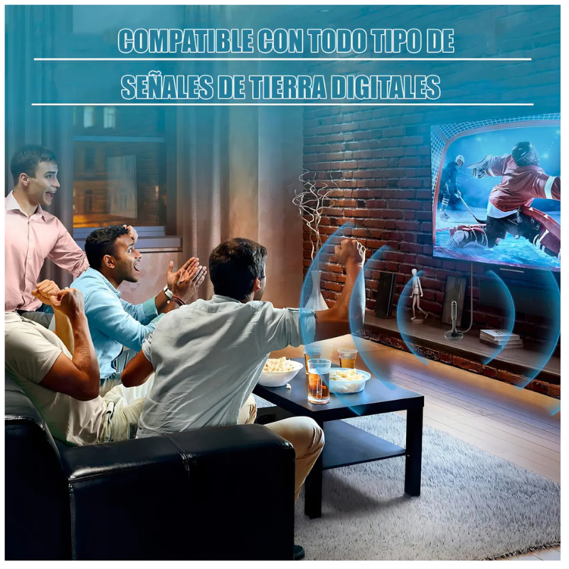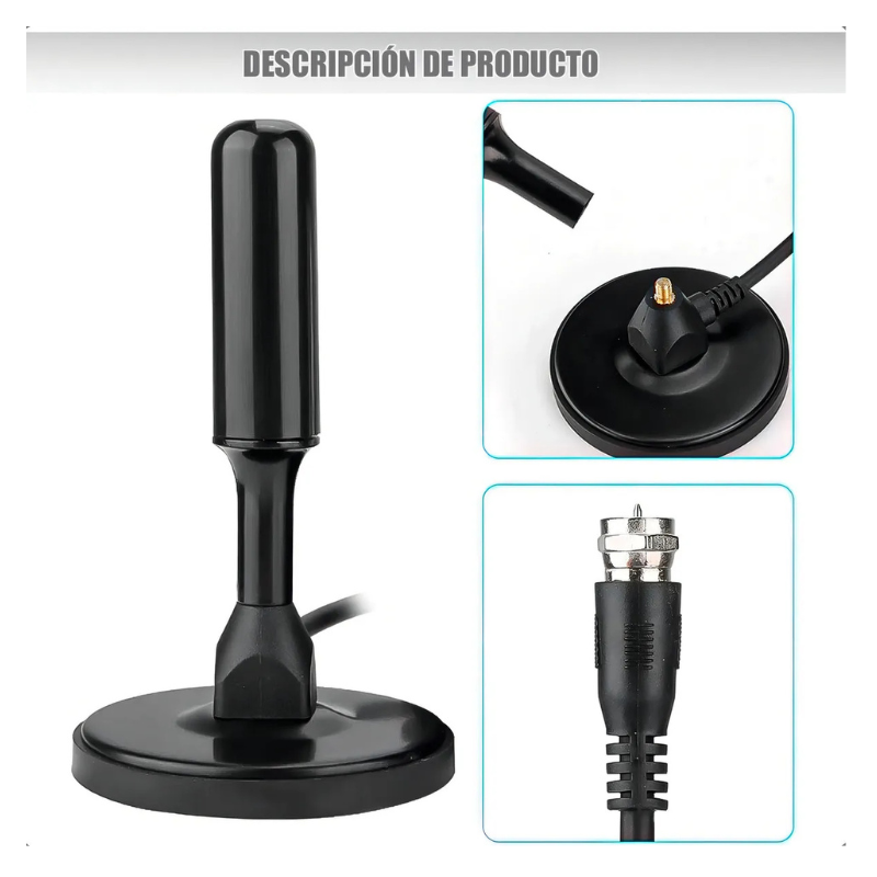 Antena de interior para sintonizar Televisión Digital Abierta Terrestre. – Tamaño pequeño. – Rendimiento estable. – Buena señal. – Mejore la intensidad y calidad de la señal digital/analógica. – Alta temperatura, resistencia a ácidos y corrosión. – Puede recibir señal de TV digital DVB-T2, el rendimiento es estable. – Longitud del cable 5 metros aprox – Compatible con TV PLASMA /LCD/ LED / Smart TV solo si son pantallas que posean sintonizador de televisión digital incluido. – Color: Negro – Conector coaxial.