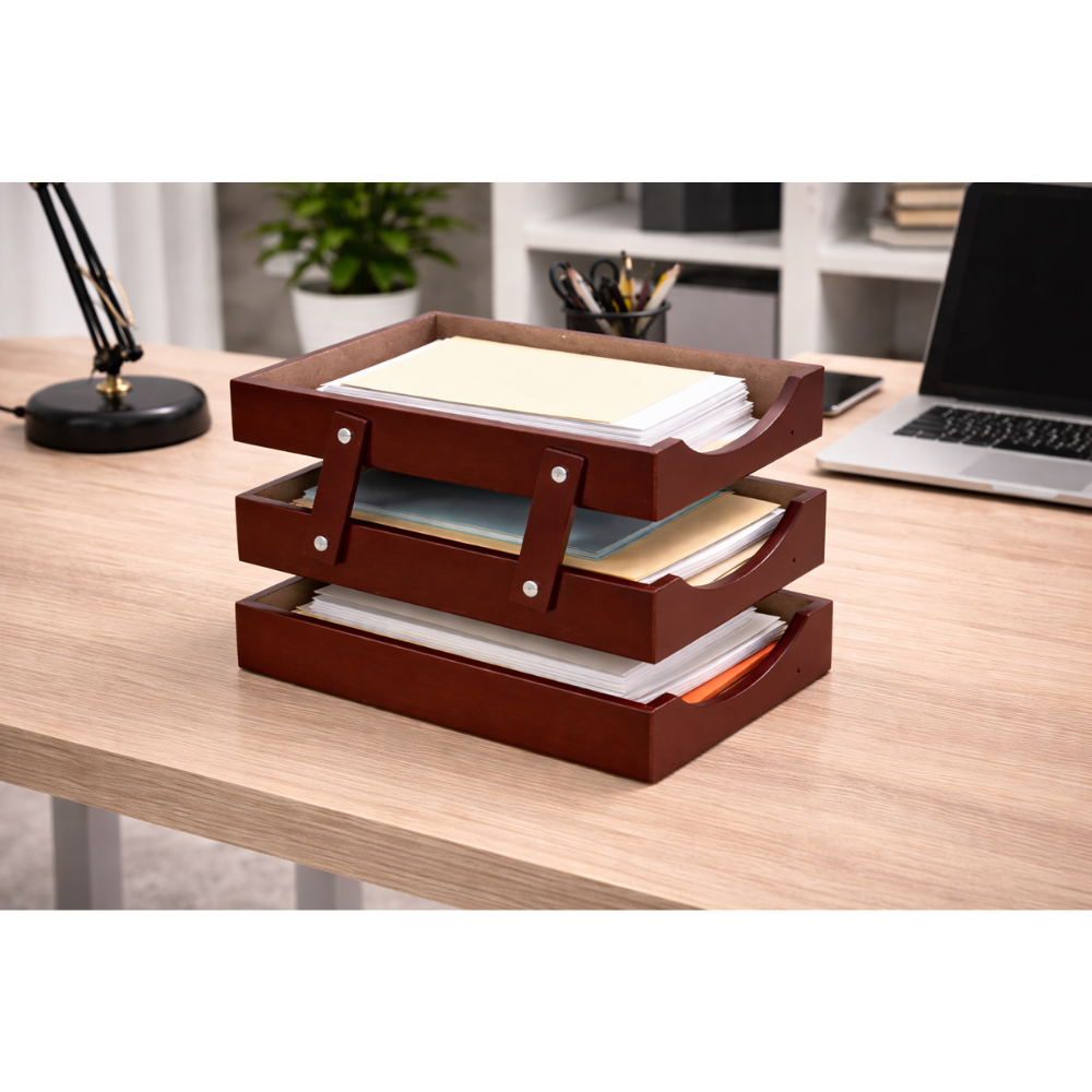 Mantén tu escritorio organizado y profesional con nuestra BANDEJA ORGANIZADORA DE DOCUMENTOS EN MADERA, diseñada para optimizar espacios de trabajo y mejorar la productividad.