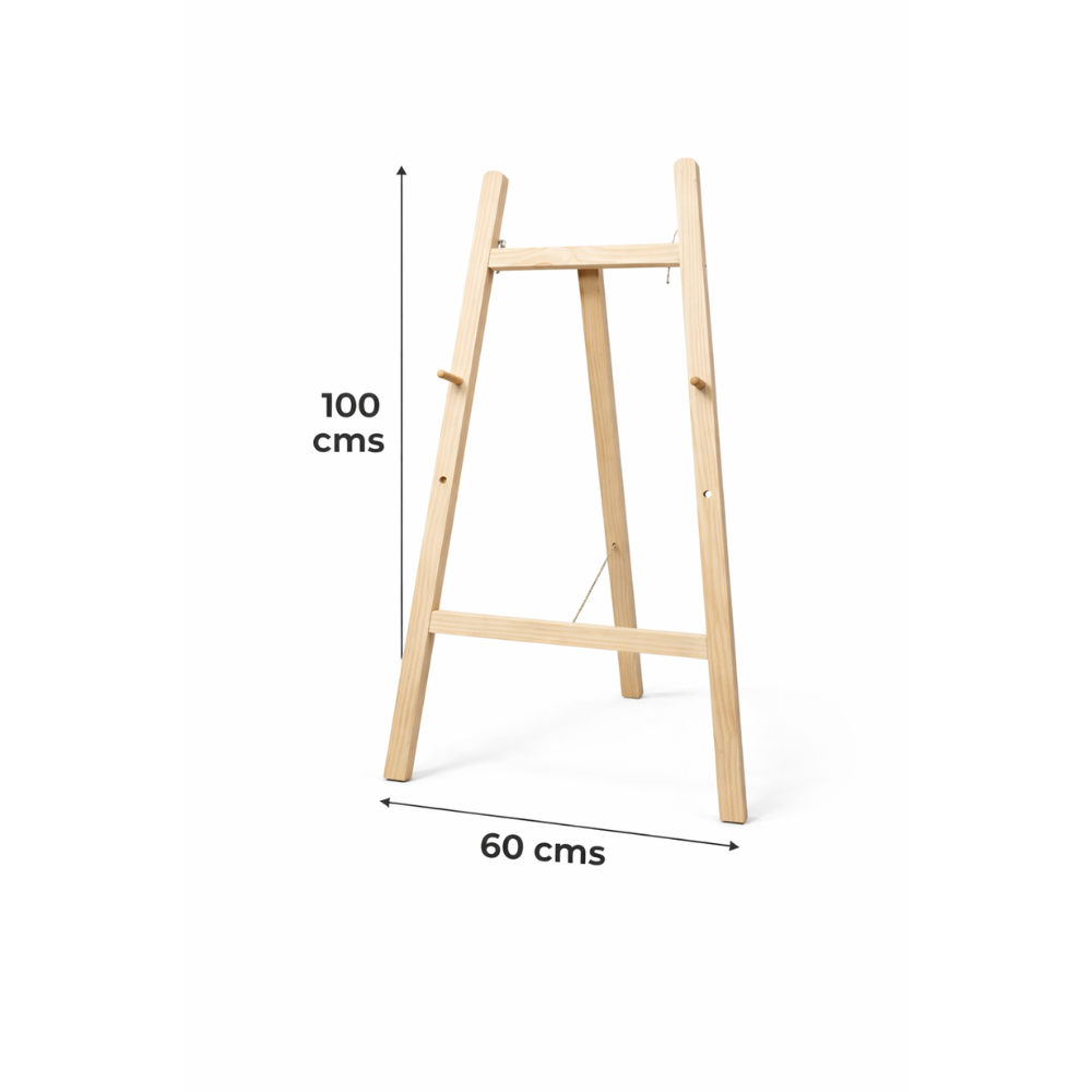 Exhibe tus cuadros, lienzos, tableros o avisos con elegancia y estabilidad usando nuestro CABALLETE TRÍPODE EN MADERA PINO NATURAL, diseñado para ofrecer resistencia, presentación profesional y fácil transporte.