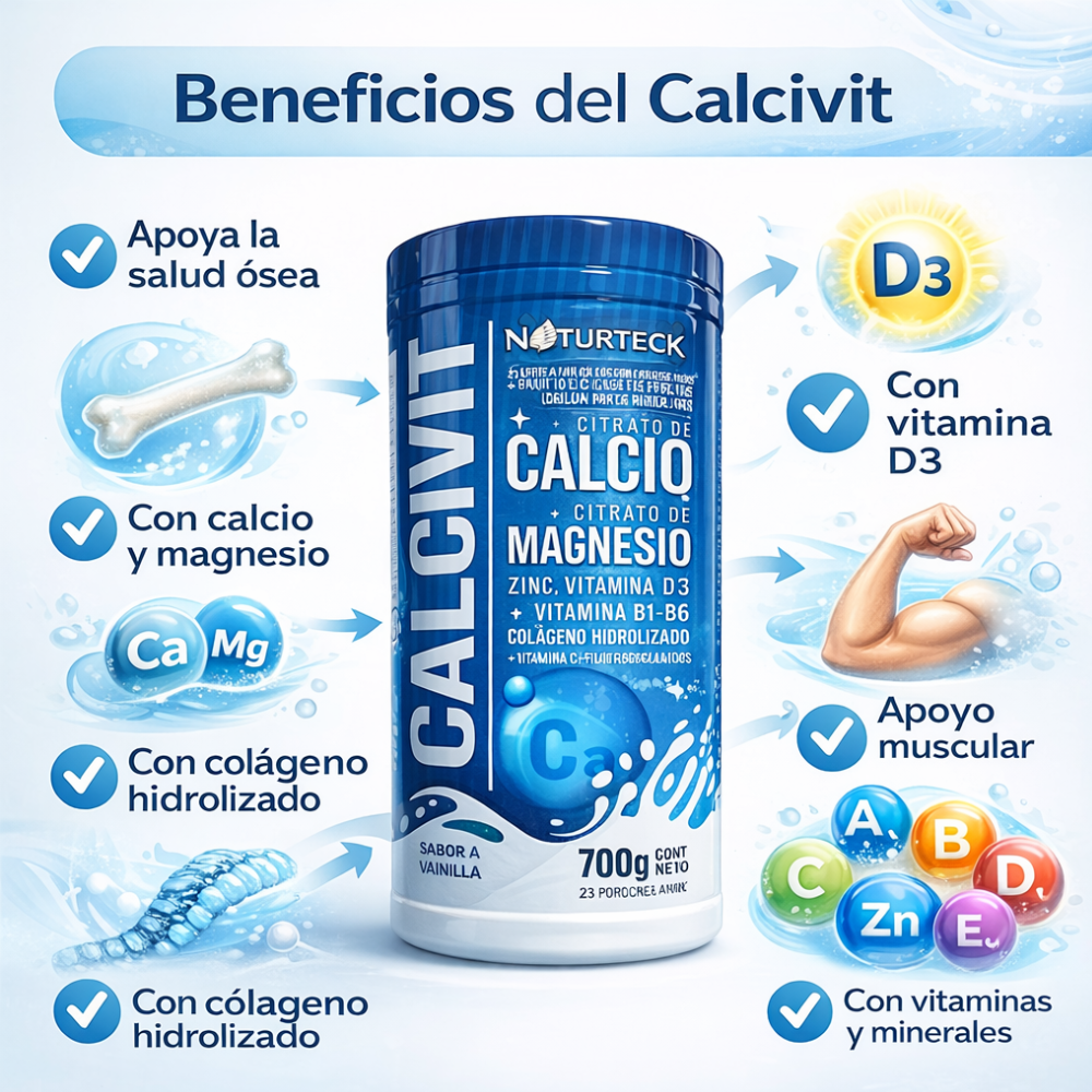 CALCIVIT es un suplemento nutricional en polvo diseñado para complementar la alimentación diaria con minerales, vitaminas y colágeno, aportando nutrientes que contribuyen al bienestar del organismo. Su fórmula combina calcio, magnesio, zinc, vitamina D3, vitaminas del complejo B, vitamina C y colágeno hidrolizado, ingredientes que participan en procesos relacionados con el mantenimiento de los huesos, músculos y articulaciones.