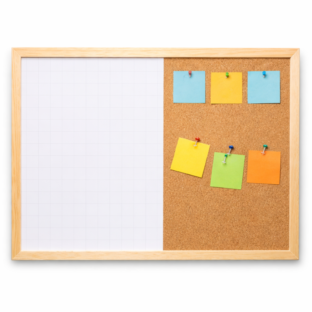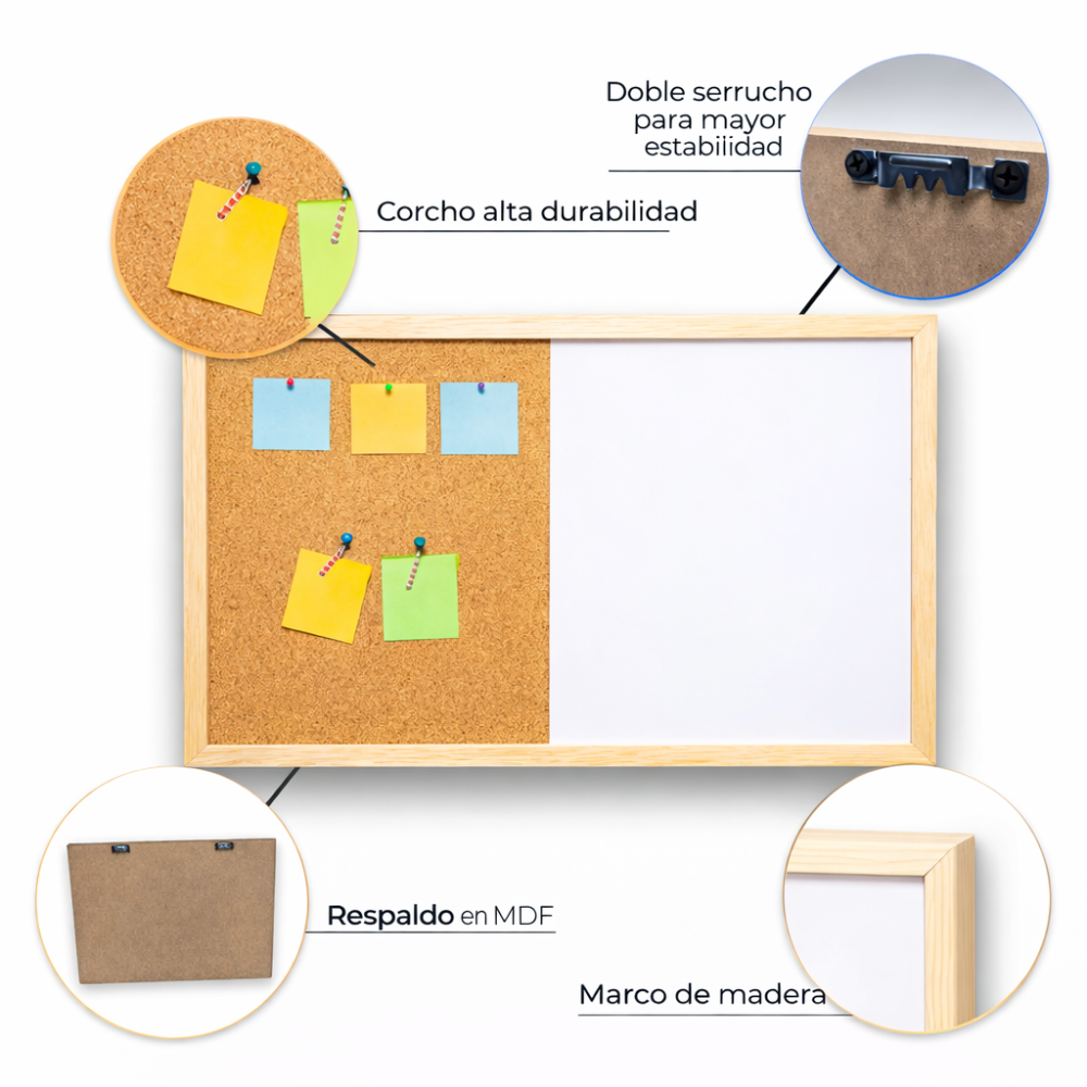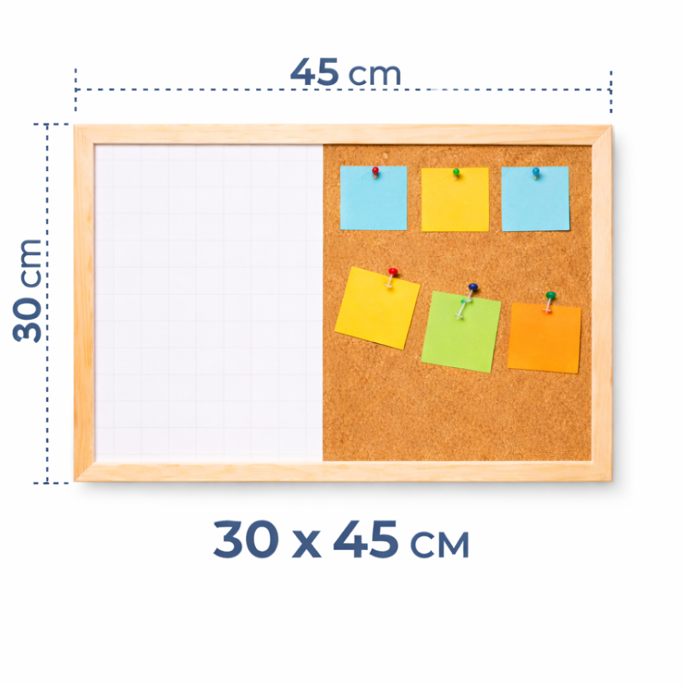 Este tablero integra una superficie acrílica blanca para marcadores borrables y una sección de corcho de alta resistencia para notas, recordatorios y avisos. Es una solución práctica para organizar tareas, ideas y comunicaciones en oficinas, hogares, negocios y espacios educativos.
