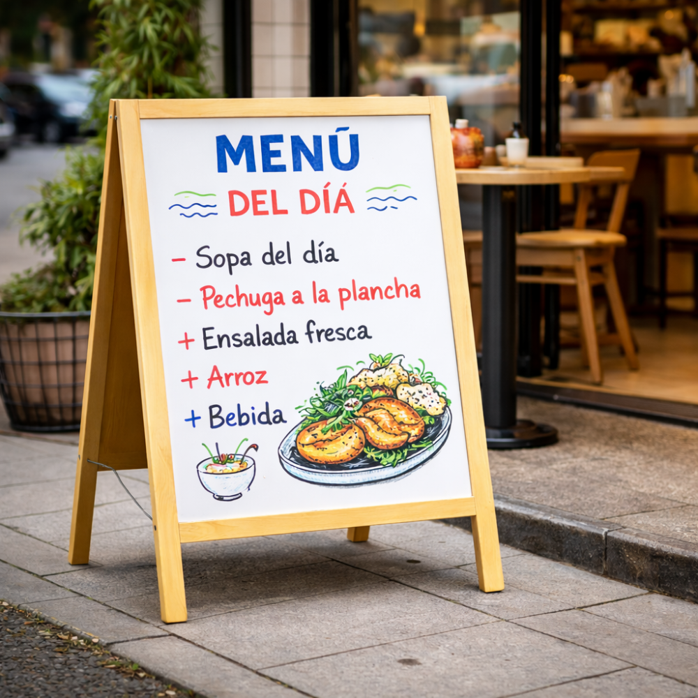 Diseñado para uso comercial, permite comunicar menús, promociones, platos del día y mensajes publicitarios de manera clara y profesional.