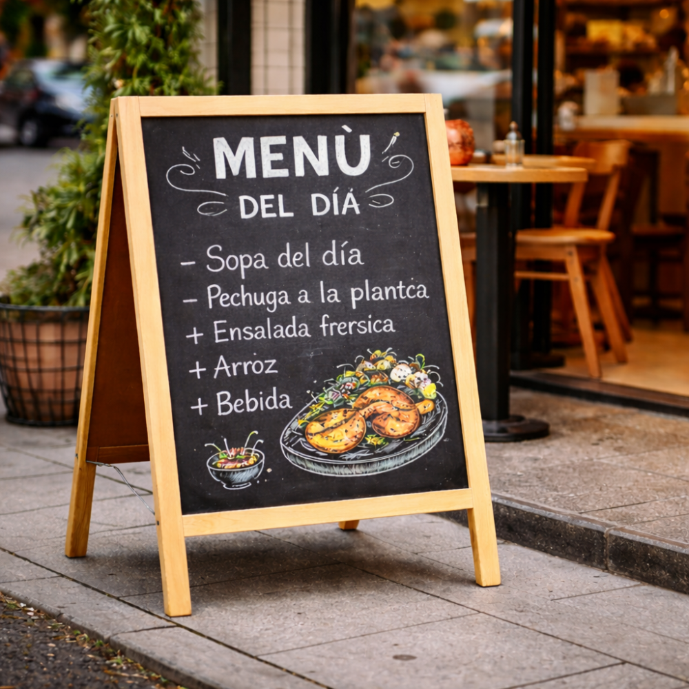 Diseñado para uso comercial, permite comunicar menús, promociones, platos del día y mensajes publicitarios de manera clara y profesional.